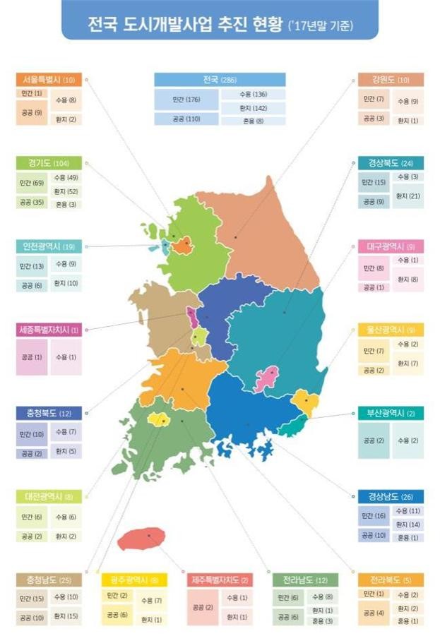 지난해 말 기준 전국 286곳에서 도시개발사업이 시행중인 것으로 집계됐다. 지역별로는 경기도가 138곳으로 가장 많고 이어 충남, 경남, 경북 순으로 나타났다.