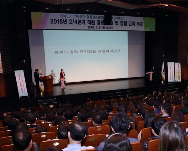 청렴실천 결의대회에 이어 ‘청탁금지법 시대의 카멜레온 대응전략’이라는 주제로 박연정 강사(現 청렴·윤리교육센터 WAR대표)가 개정된 청탁금지법 주요내용 및 사례교육을 실시했다.