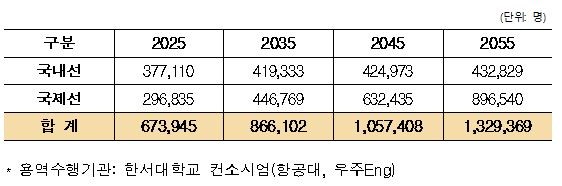 국토교통부는 새만금 신공항 항공수요 조사 결과, 국내선·국제선을 종합해 2025년 기준 67만 명, 2055년 기준 133만 명의 수요가 예측된다고 11일 밝혔다.
