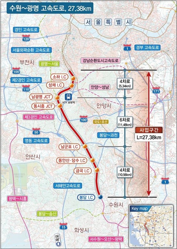 지난 2016년 4월 개통한 수원~광명 민자고속도로는 경기 화성시 봉담읍에서 광명시 소하동을 연결하는 고속도로로 국도1호선, 경부고속도로의 교통을 분담해 경기 서남부지역의 접근성 개선 및 교통 혼잡 개선에 기여해왔다.