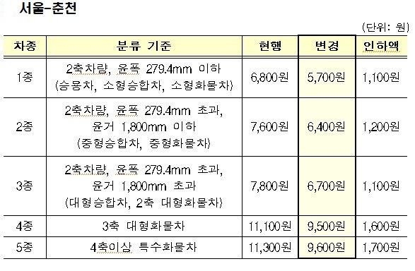 이번 인하 조치로 서울~춘천 민자고속도로는 최장거리(61.4km) 기준 통행료는 승용차(1종 차량)의 경우 6800원에서 5700원으로 1100원 인하(16.2%)되고, 대형 화물차(4종 차량)는 1만1100원에서 9500원으로 인하(14.5%)되는 등 차종별로 각각 차등 인하된다.