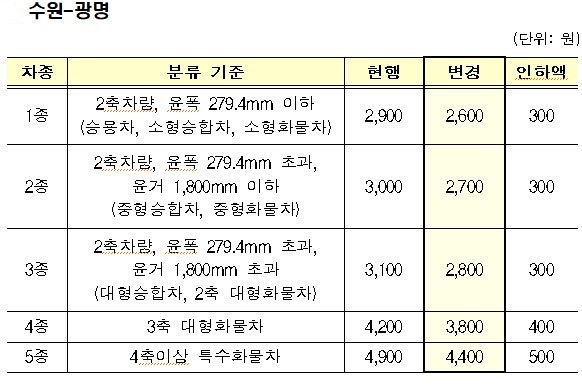 또한 수원~광명 민자고속도로는 최장거리(27.4km) 기준 통행료는 승용차(1종 차량)의 경우 2900원에서 2600원으로 300원 인하(10.3%)되고, 대형 화물차(4종 차량)도 4200원에서 3800원으로 인하(10.5%)되는 등 차종별로 각각 인하된다.