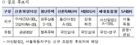 공모 후보지는 주거복지로드맵의 계층별, 유형별 다양성을 감안해 신혼희망타운 ▲수서KTX A-3블록 ▲고양지축 A-2블록, 청년주택 ▲완주삼봉 S-1블록, 신혼특화단지 ▲울산다운2 A-5블록, 지방소도시 ▲강원화천, 세대통합형 ▲아산탕정2 A-15블록, 도시정비사업 ▲서울목동 등 7개 단지를 선정했다.