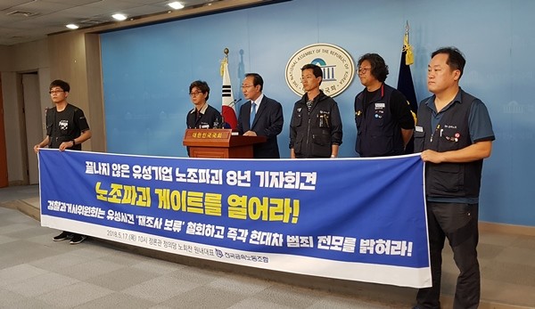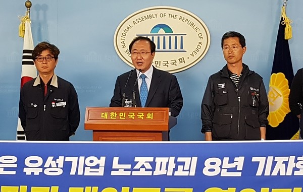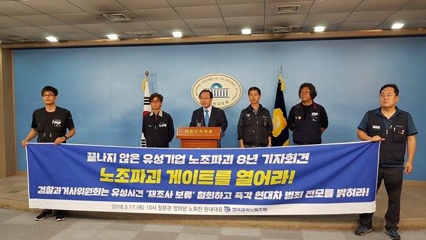노회찬 정의당 국회의원은 17일 국회 정론관에서 전국금속노동조합과 공동으로 기자회견을 열고 “검찰 과거사위원회가 유일한 노동사건인 유성기업 노조파괴 사건을 본조사 대상에서 제외했다”며 “현대차가 유성기업의 노조파괴에 직접 개입한 혐의를 받고 있는 이 사건을 재조사 보류한 것은 문재인 정부의 검찰 개혁의지가 현대차 재벌앞에 굴복한 것”이라고 지적했다.