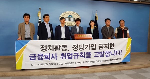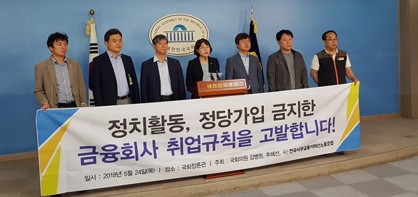 국회 강병원 더불어민주당 의원과 추혜선 정의당 의원은 24일 국회 정론관에서 사무금융노동조합과 공동으로 기자회견을 열고 금융권