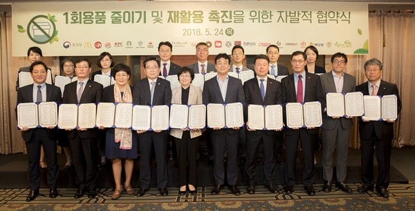 환경부는 지난 24일 서울 중구 롯데호텔에서 16개 커피전문점, 5개 패스트푸드점, 자원순환사회연대와 함께 1회용품을 줄이고 재활용을 촉진하기 위한 자발적 협약을 체결했다고 밝혔다.