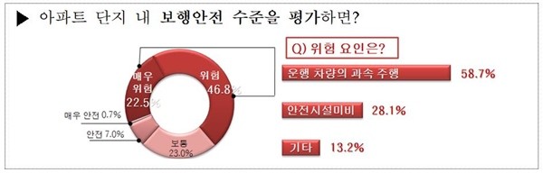 설문조사 결과 아파트 단지 내 보행안전 수준에 대한 질문에 위험하다는 답변이 69.3%로 가장 많았다. 이어 보통(23%), 안전(7.7%) 순이었다.