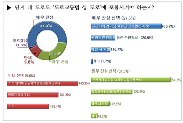 단지 내 도로도 ‘도로교통법 상 도로’에 포함시켜야 하는지에 대한 질문에는 매우 찬성(57.5%), 일부 찬성(31.3%), 반대(9.6%) 등을 선택했다.