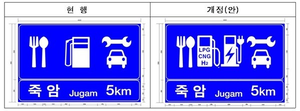 개정된 지침에 따르면 고속도로 휴게소 안내표지에 전기차·수도차 등 친환경차 연료 충전시설 안내가 추가된다. 기존 휴게소 안내표지에는 주유소, LPG 충전소만 안내할 수 있었다.