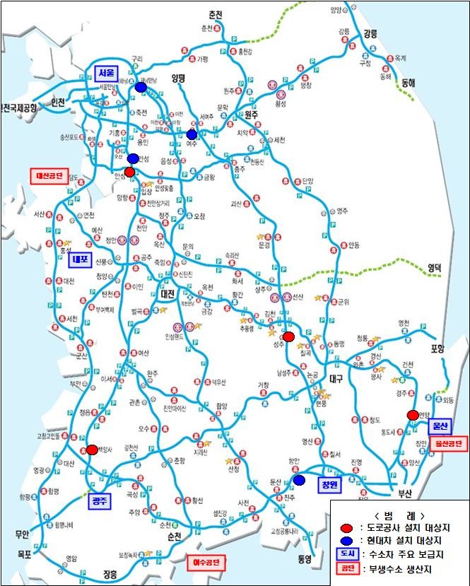 설치 위치는 수소차의 주요 보급지와 수도권간의 주요 경로에 위치한 휴게소를 대상으로 검토했다. 특히, 차량의 주행가능거리를 고려해 장거리 이동에 불편이 없도록 최우선으로 필요한 위치를 선정했다.