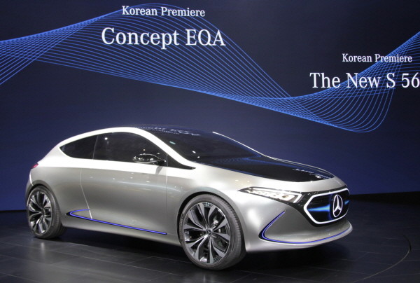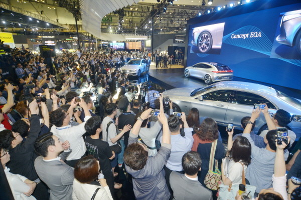 글로벌 브랜드 중 1관에 있는 ▲벤츠는 다양한 클래식카 전시와 전기차 브랜드 EQ의 기술력을 선보이는 하이브리드 모델 GLC 350 e 4MATIC, 미드사이즈 세단 C 클래스 하이브리드 The New C350 e, 컨셉카 EQA 등 16대