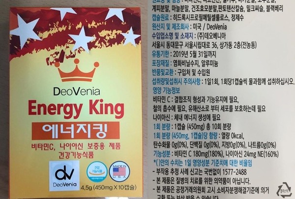 식품의약품안전처는 서울 동대문구 소재 식품수입판매업체 데오베니아가 수입·판매한 건강기능식품 ‘에너지킹’(비타민C, 나이아신 보충용) 제품에서 발기부전치료제인 타다라필이 78 mg/kg 검출(기준 불검출)돼 판매중단 및 회수조치 한다고 밝혔다.