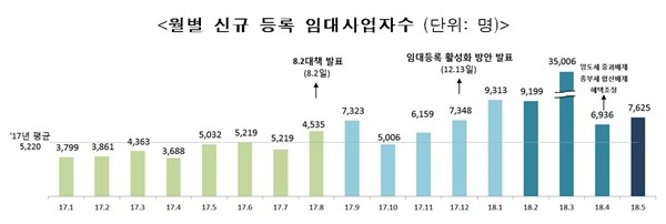 5월에 등록한 임대사업자 수(7625명)는 전년 동월(5032명)에 비해 51.5% 늘었고, 지난해 한해 월 평균(5220명)에 비해서도 46.1% 증가했다. 누계로는 총 32만5000명이 임대사업자로 등록했다.