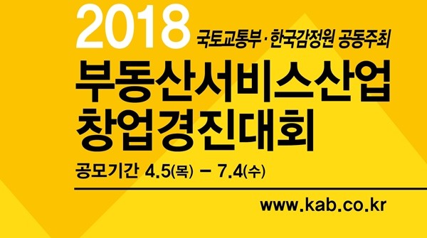 한국감정원은 국토교통부와 공동으로 부동산분야 창업 아이디어를 발굴·지원하기 위해 ‘2018년 부동산서비스산업 창업경진대회’를 개최한다고 12일 밝혔다.
