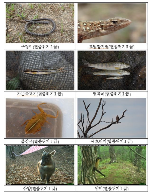 멸종위기 야생생물 1급은 사향노루, 수달 등 포유류 6종, 검독수리, 노랑부리백로 등 조류 10종을 비롯해 수원청개구리(양서류)와 흰수마자(담수어류)를 포함해 총 18종이 확인됐다.