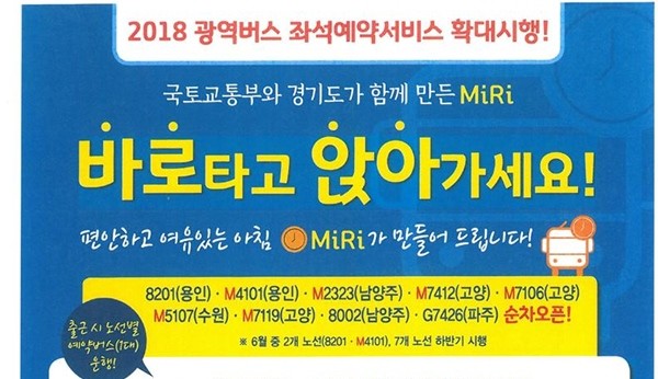 경기도의 경우 광역버스 중 3개 노선(8201, G7426, 8002)에 대해 8201(용인) 노선은 오는 25일부터, G7426(파주)ㆍ8002(남양주) 노선은 올해 하반기 중 순차적으로 좌석예약제를 도입할 계획이다.
