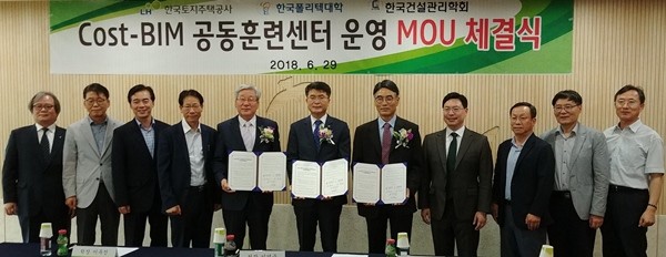 LH는 성남시 LH 경기지역본부에서 한국폴리텍대학 및 한국건설관리학회와 BIM 관련 중소기업의 전문인력 양성을 위해 지난 29일 ‘Cost-BIM 공동훈련센터 운영’에 관한 업무협약을 체결했다고 밝혔다.