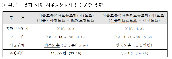 서울교통공사 통합 다시 서울메트로의 민주노총 산하 노조는 한국노총 산하 노조에 비해 규모가 약 2,6배 컸으며, 도시철도공사의 경우에는 12.2배가 컸던 것으로 알려졌다.
