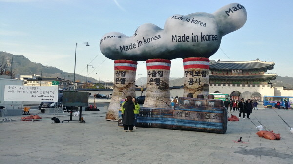 국제환경단체 그린피스 서울사무소는 오늘 광화문 북측광장에 석탄발전소 모양의 대형 에어벌룬을 설치하고, 한국의 해외 석탄발전소 투자 중단을 촉구했다.