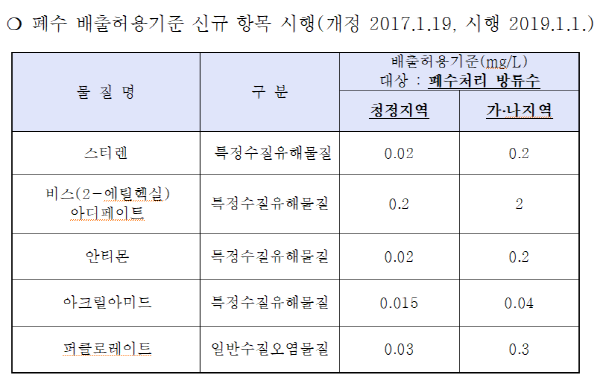 이들 수질오염물질은 지난 2017년 1월 마련된 ‘폐수 배출 허용기준’에 명시됐으나, 사업장 준비 기간 등을 고려해 2년간의 유예기간을 거친 뒤 2019년 1월1일부터 검사 대상에 정식으로 포함됐다.