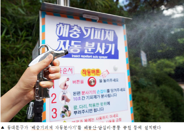 동대문구(구청장 유덕열)가 지난해 배봉산공원 입구에 ‘해충기피제 자동분사기’를 시범 설치·운영한 데 이어 올해 4월, 구민이 즐겨 찾는 공원에 ‘해충기피제 자동분사기’를 추가로 설치했다.