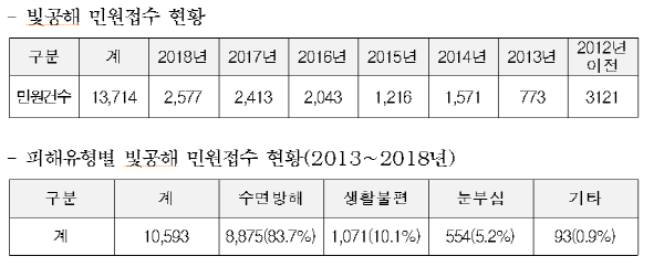 신 의원에 따르면 서울시에 접수된 빛공해 민원은 2013년 773건에서 2018년 2,577건으로 급격히 증가하였고, 이와함께 무분별한 조명기구 설치로 인한 시민들의 피해 역시 급증하는 실정이며, 피해유형은 수면방해(83.7%), 생활불편(10.1%), 눈부심(5.2%) 순인 것으로 나타나, 이에 대한 대책마련이 시급한 상황이다.