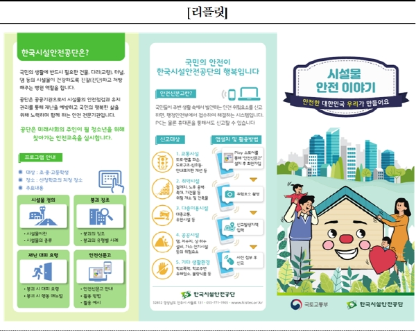 안전교육은 청소년의 눈높이에 맞춰서 일상생활에서 자주 이용하는 학교·스포츠·관람시설 등에 대한 시설물별 재난사고 발생 징후 및 행동요령 리플릿을 삽화 형식으로 제작하여 배포하고, 3D 입체퍼즐 놀이형 교재를 활용하여 재미와 놀이를 접목한 맞춤형 안전교육으로 진행한다. 그동안 청소년 대상 안전교육 프로그램은 많았지만 시설물 관련 안전교육은 최초이다.