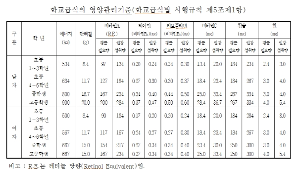 학교급식의 영양관리기준(학교급식법 시행규칙 제5조제1항)