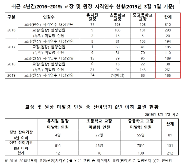 문제는 이들 중 정년퇴직까지 4년도 채 남지 않아 교장으로 임용되어 임기를 채우기가 어렵다고 간주되는 인원이 2019년 현재 무려 81명(31%)에 달하고 있다는 것이다. 심지어 정년까지 임기가 1년도 남지 않은 교원도 무려 10명이나 존재하는 것으로 파악됐다. 교육공무원법 제 29조의 2에 따르면 교장 및 원장의 임기는 4년이며, 1회 중임할 수 있도록 규정되어 있다.