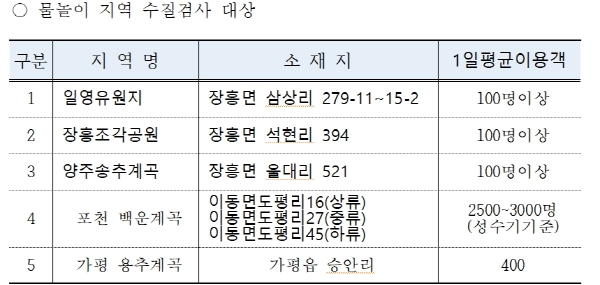 수질검사 대상 지역은 ▲양주 일영유원지 ▲장흥조각공원 ▲송추계곡 ▲포천 백운계곡 ▲가평 용추계곡 등 5곳으로, 조사 항목은 대장균이다.