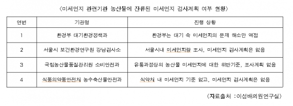 이런 상황에도 불구하고 시중에 유통 중인 농산물에 대한 미세먼지 유해성 및 검사에 대한 연구가 전혀 이루어지지 않고 있으며, 특히 환경부, 국립농산물품질관리원, 식품의약품안전처 등 미세먼지 관련 기관에서조차도 농산물에 잔류된 미세먼지 검사진행 계획은 없는 것으로 나타났다.