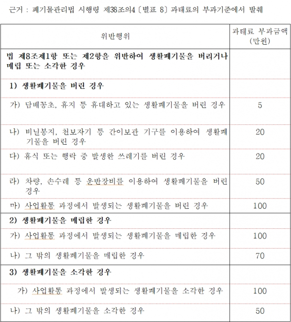 휴가철 행락 중에 발생한 쓰레기를 버리는 경우에는 20만 원의 과태료가 부과되며, 소각, 매립, 투기 형태별로 최대 100만 원까지 과태료를 부과할 수 있다.