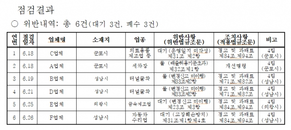이번 점검을 통해 적발된 위반행위는 ▲폐수 배출허용기준 초과 1건 ▲변경신고 미신고 3건 ▲고장훼손방치 1건 ▲운영일지 미작성 1건 등 총 6건이다.
