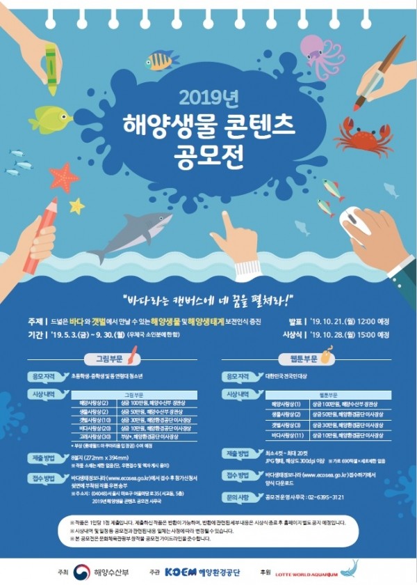 해양수산부 주최, 해양환경공단 주관으로 진행되는 이번 공모전의 접수기간은 5월 3일부터 9월 30일까지 진행 중이며, 10월 중 심사를 거쳐 총 81점의 수상작을 선정하고, 총 1,200만원의 상금을 지급할 계획이다.