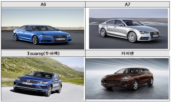 적발된 경유차량 8종은 아우디 A6 3종(FMY-AD-14-11, FMY-AD-14-10, HMY-AD-14-13), 아우디 A7 2종(FMY-AD-14-12, HMY-AD-14-08), 폭스바겐 투아렉 2종(FMY-AD-14-27, HMY-AD-14-19), 포르쉐 카이엔 1종(FMY-SG-14-01)이다.