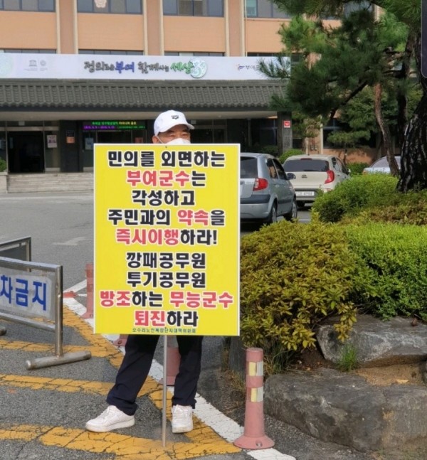 부여 규암면 오수리 노인복합단지 조성사업 비리 의혹과 관련해 박정현 부여군수의 퇴진을 요구하는 한 주민이 지난 5일 부여군청 앞에서 1인 시위를 벌이고 있다.