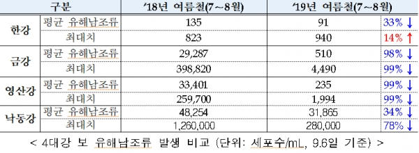 올해 낙동강 8개 보의 평균 유해남조류세포수는 작년의 7~8월과 비교했을 때 34%, 한강은 33%가 감소한 것으로 나타났으며, 금강과 영산강의 경우 98% 이상의 감소율을 나타냈다.