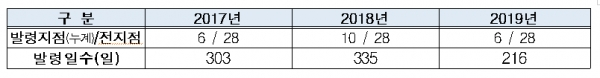 경보 발령일수는 216일로 지난해 같은 기간 335일에 비해 약 36% 감소했으며 최근 3년간 가장 낮은 수치를 기록했다.