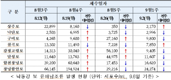 4대강 16개 보 구간(보 상류 500m)에서 주간 단위로 유해남조류를 분석한 결과 9월 첫째주 낙동강(8개보)은 상주보, 칠곡보를 제외하고 8월에 비해 전반적으로 감소추세를 보이고 있다.