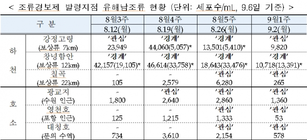 올해는 지난 6월 20일 낙동강(창녕함안)에서 처음으로 관심 경보가 발령된 이후, 현재 총 6곳(누계)에서 경보가 발령 중이며, 이는 지난해 같은 기간 10곳(누계)에 비해 크게 줄어든 수치다.