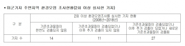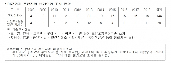 환경부가 <주한미군 공여구역 특별법>에 따라 주한미군 기지주변에 대한 환경오염조사를 실시한 결과, 2008년부터 지난해까지 11년간 총144차례 조사에서 80차례(55.6%)나 기준초과 오염물질이 검출되었다.