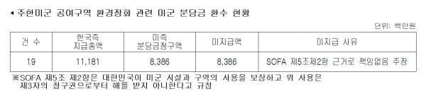 일단 해당 지자체에서 정화를 하고 그 비용을 국가배상법 절차에 따라 미군에게 청구하게 되는데, 법무부가 유의동 의원실에 제출한 자료에 따르면, 미군은 83억8,600만원에 달하는 환경정화 분담금 중 단 한 푼도 지급하지 않은 것으로 나타났다.