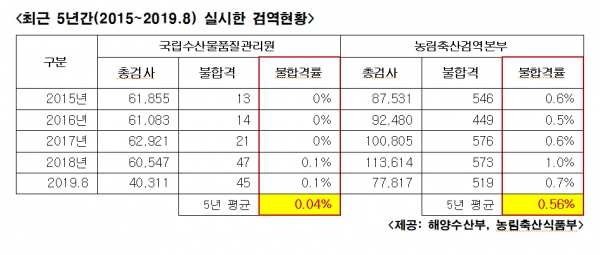 수품원의 불합격률은 농림축산검역본부와도 현격한 차이를 드러냈다. 수품원의 5년 평균 검역 불합격률은 0.04%이었지만 농림축산검역본부의 경우, 0.56%로 집계돼 수품원보다 10배 이상 높은 적발률을 보였다.