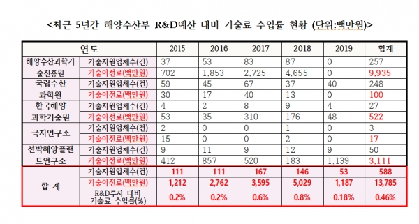‘2017년 국가연구개발사업 성과분석 보고서’에 따르면 해수부의 기술료 수입률(로열티)는 정부전체 기술료 수입률 1.2% 대비 1/3에 불과하고 중기부 2.4%, 산업부 2.1%와 5~6배 차이를 보이고 있다.