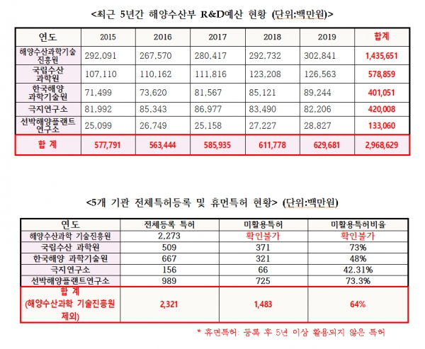 5년간 1조 4356억원의 연구개발(R&D)을 수행한 해양수산과학 기술진흥원은 기업체, 연구기관에 R&D비용을 투자하고 있으나 특허가 어떻게 활용되고 있는지에 대한 사후관리가 전혀 되지 않고 있다.‘깜깜이 투자’,‘묻지마 투자’라는 지적을 피할 수 없다.