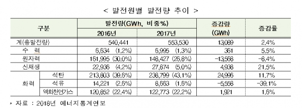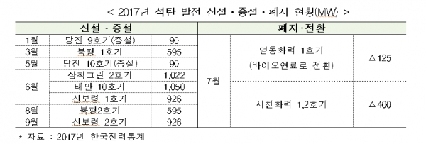 2) 신설 6기 5,114MW(북평 1?2호기 1,190MW, 신보령 1?2호기 1,852MW, 삼척그린 2호기 1,022MW, 태안 10호기 1,050MW) (자료 : 2017년 한국전력통계)