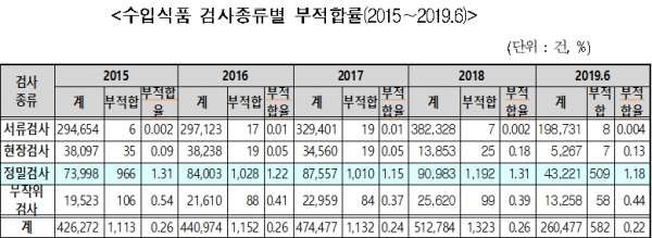 또한 ‘수입식품 검사 부적합률’ 자료를 보면, 전체 부적합율은 지난해 0.26%, 금년 상반기 0.22%로 나타났으며, 품목군별로는 건강기능식품 부적합율이 지난해 1.01%, 금년 상반기 0.63% 등으로 상대적으로 높았습니다.
