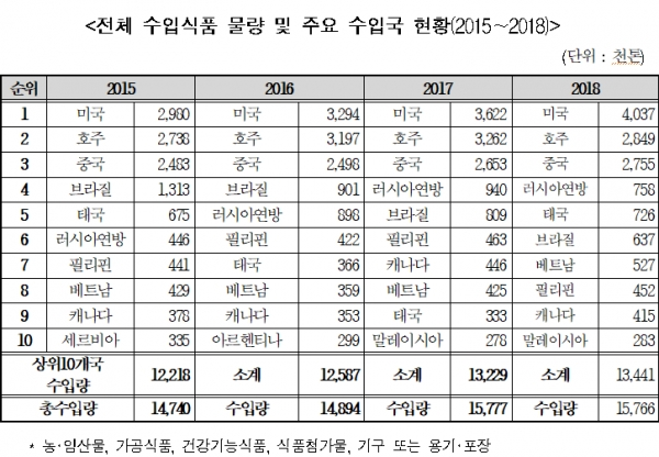 한편 식품의약품안전처가 남인순 의원에 제출한 ‘전체 수입식품 물량 및 주요 수입국 현황’자료에 따르면, 수입식품은 매년 수입량이 증가하여 2018년의 경우 1,576만6천톤이 우리나라로 들어온 것으로 집계되었으며, 수입물량은 미국 403만7천톤, 호주 284만4천톤, 중국 275만5천톤 등의 순으로 많았으며, 이들 3개국의 수입물량이 964만1천톤으로 전체 수입물량의 61.1%를 차지하고 있는 것으로 분석되었다.