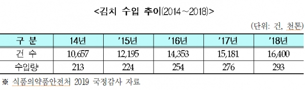 남인순 의원은 “수입식품, 특히 수입김치에 대해 안전관리를 강화할 필요가 있으며, 최근 3년간 수입실적이 있는 수입김치 해외제조업소가 87개소를 대상으로 「수입식품안전관리특별법」에 따라 현지실사를 확대 실시해야 한다”고 강조했다.