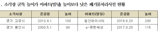 간접영향권 안에 있으면서 소각시설의 굴뚝 높이가 아파트 높이보다 낮은 곳은 경기 고양시의 A아파트와 용인시의 B아파트이다. 이들 아파트들은 소각시설보다 각각 6년, 17년 늦게 입주한 것으로 확인됐다.